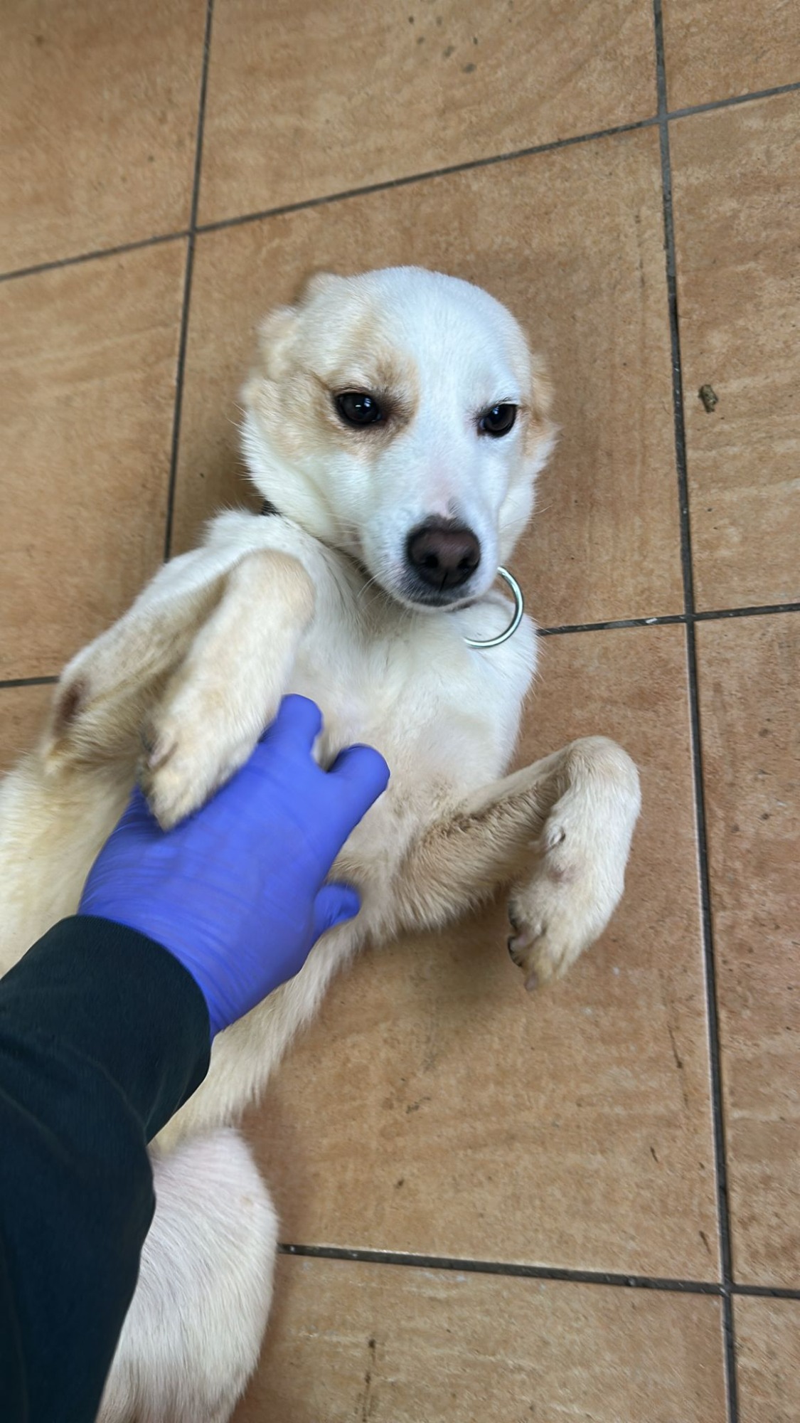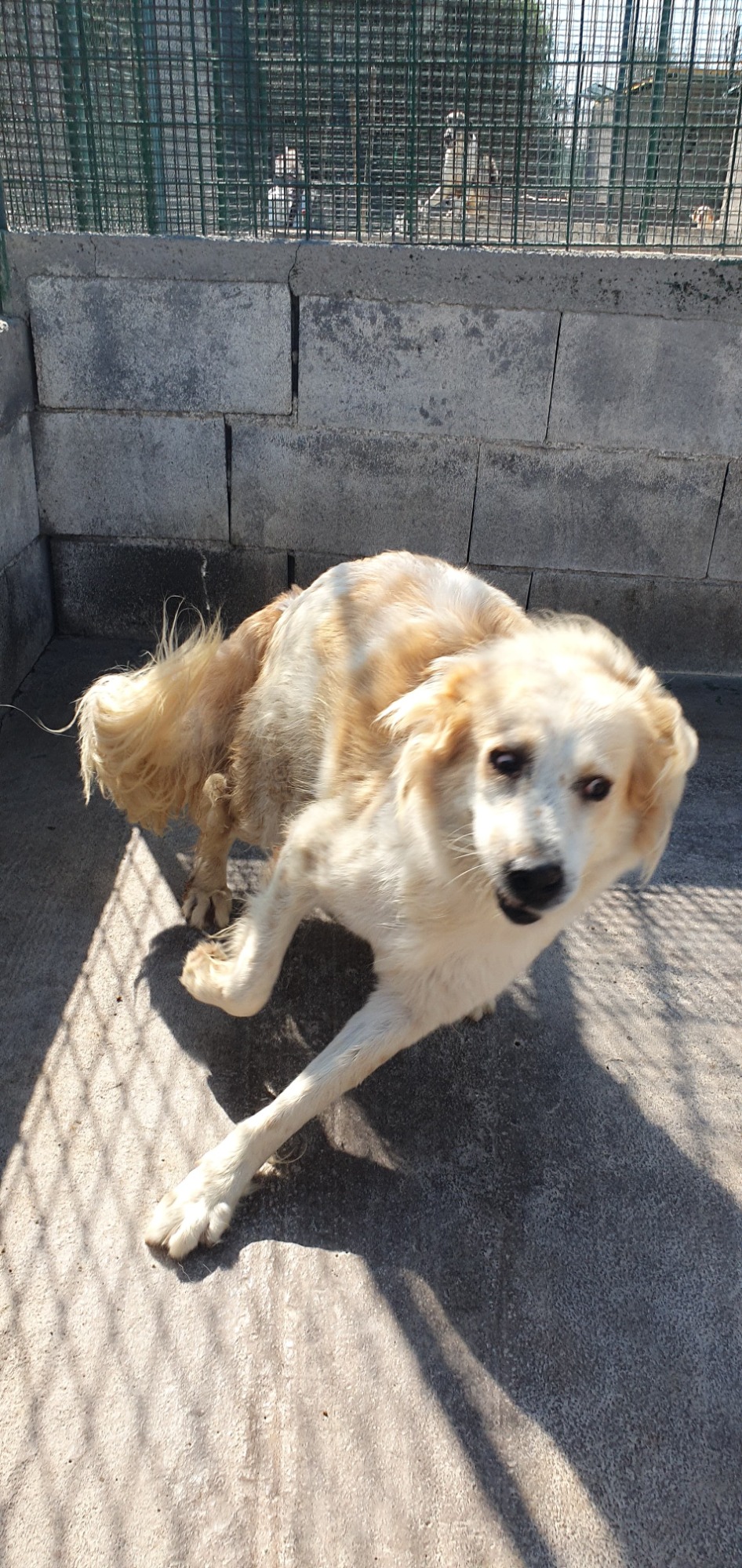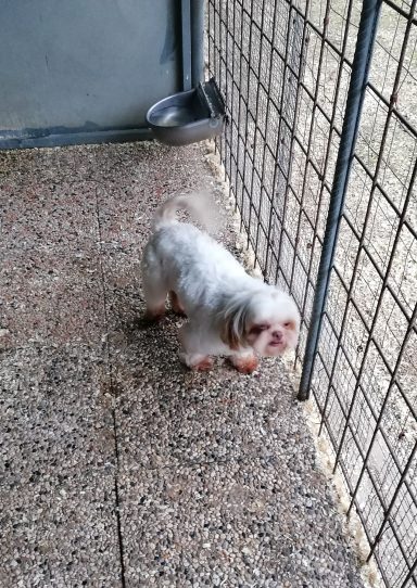 Er ist einer der Hunde die bei einem brutalen Hundenhàndler beschlagnahmt wurden und ihr Leben lang nur in ihrem Kot und Urin lagen.